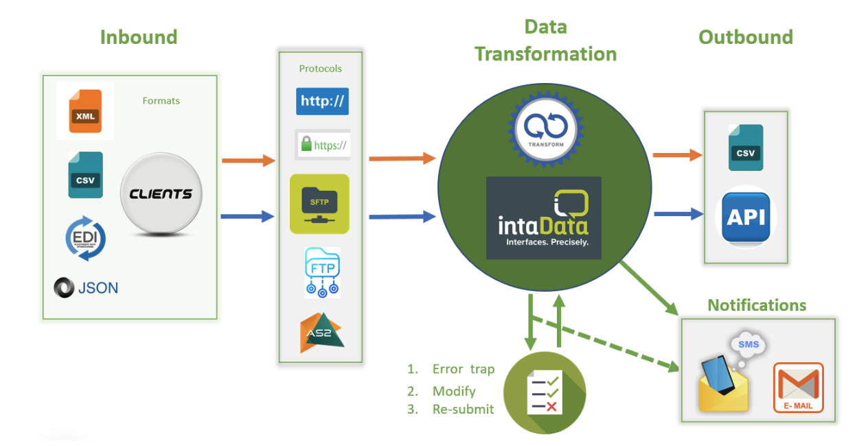 IntaData takes inbound data (inbound), transforms it into a different file or format (transformation) and sends it to suppliers, partners and other third parties (outbound).